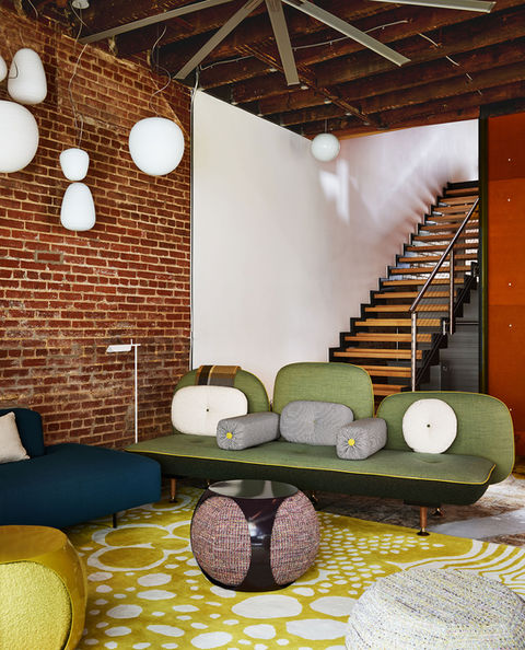 Modernism and green building guided the restoration of this home, and resulted in exposed beams, concrete floors and open spaces. After construction, we harnessed our clients’ love for eclecticism and color, and focused on the core purpose and feel of each space. We chose a colorful sofa and rug, and added nine Foscarini pendants, to make this otherwise dark first-floor living room feel vibrant at any time of day.